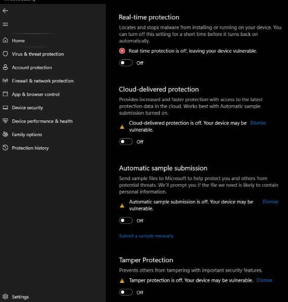 <div align="left" data-with-frame="true"><figure><img src="https://2643661057-files.gitbook.io/~/files/v0/b/gitbook-x-prod.appspot.com/o/spaces%2FKRqPgBHf0r62Wheffa8F%2Fuploads%2FQ8l38maOOZ2vUUGD8WaA%2Fimage.png?alt=media&#x26;token=26b6cfb9-ec9e-45d3-9484-57a3cc06fcc0" alt="DControl showing Windows Defender turned off" width="320"><figcaption></figcaption></figure></div>